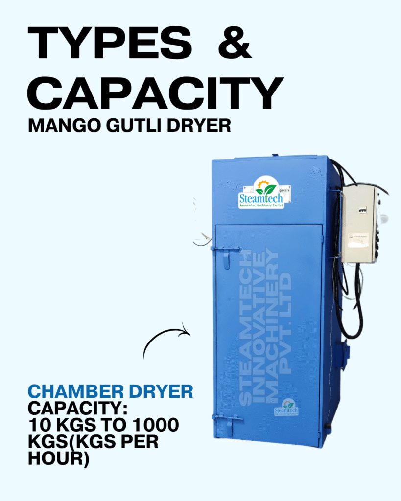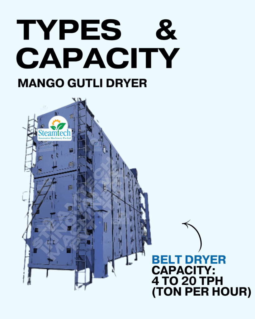 Mango Gutli Dryer Capacity ranges from 50 Kgs to 5000 Kgs per hour. Mango Gutli Dryer can be operated throughout the year even during off season.